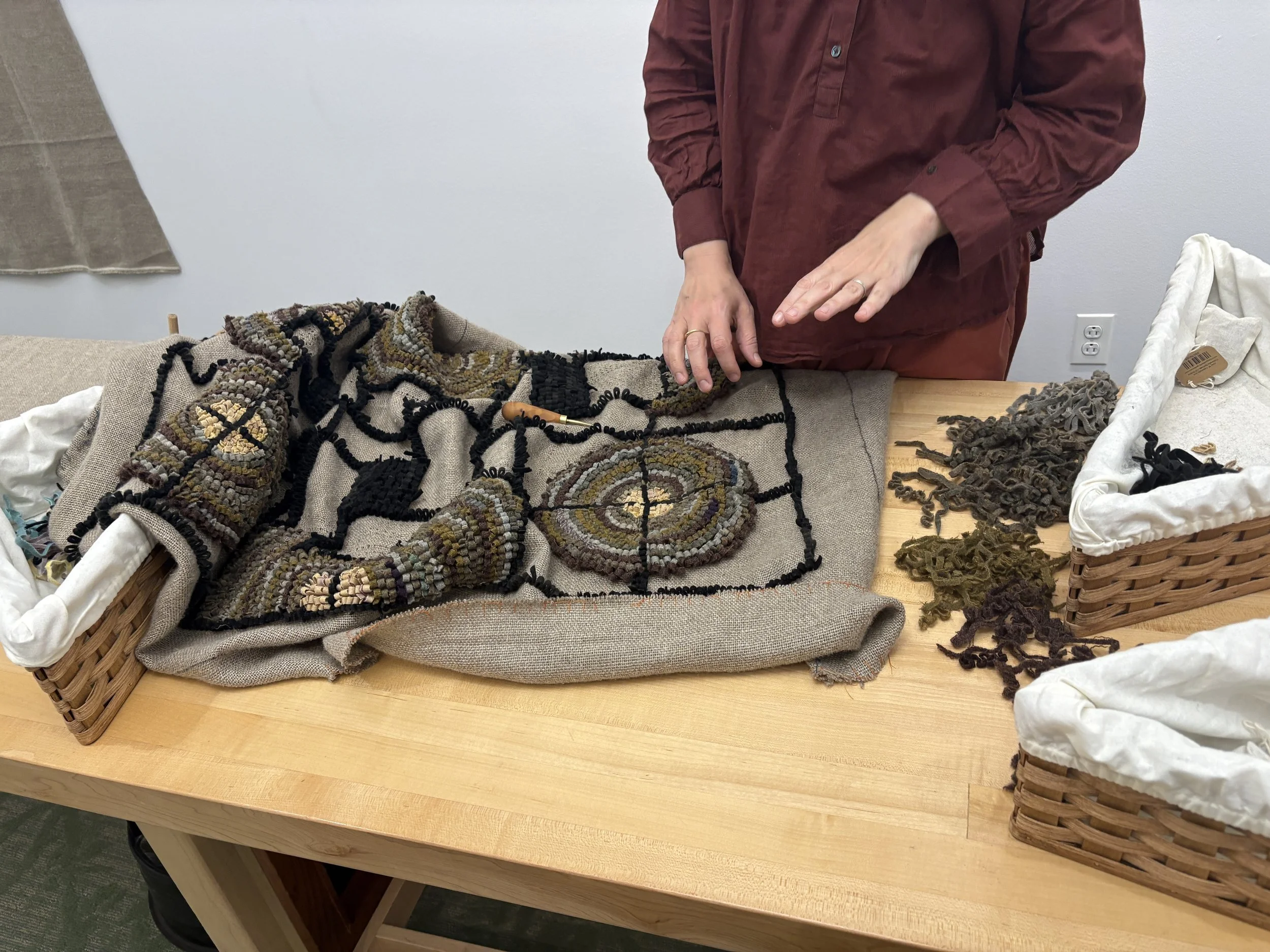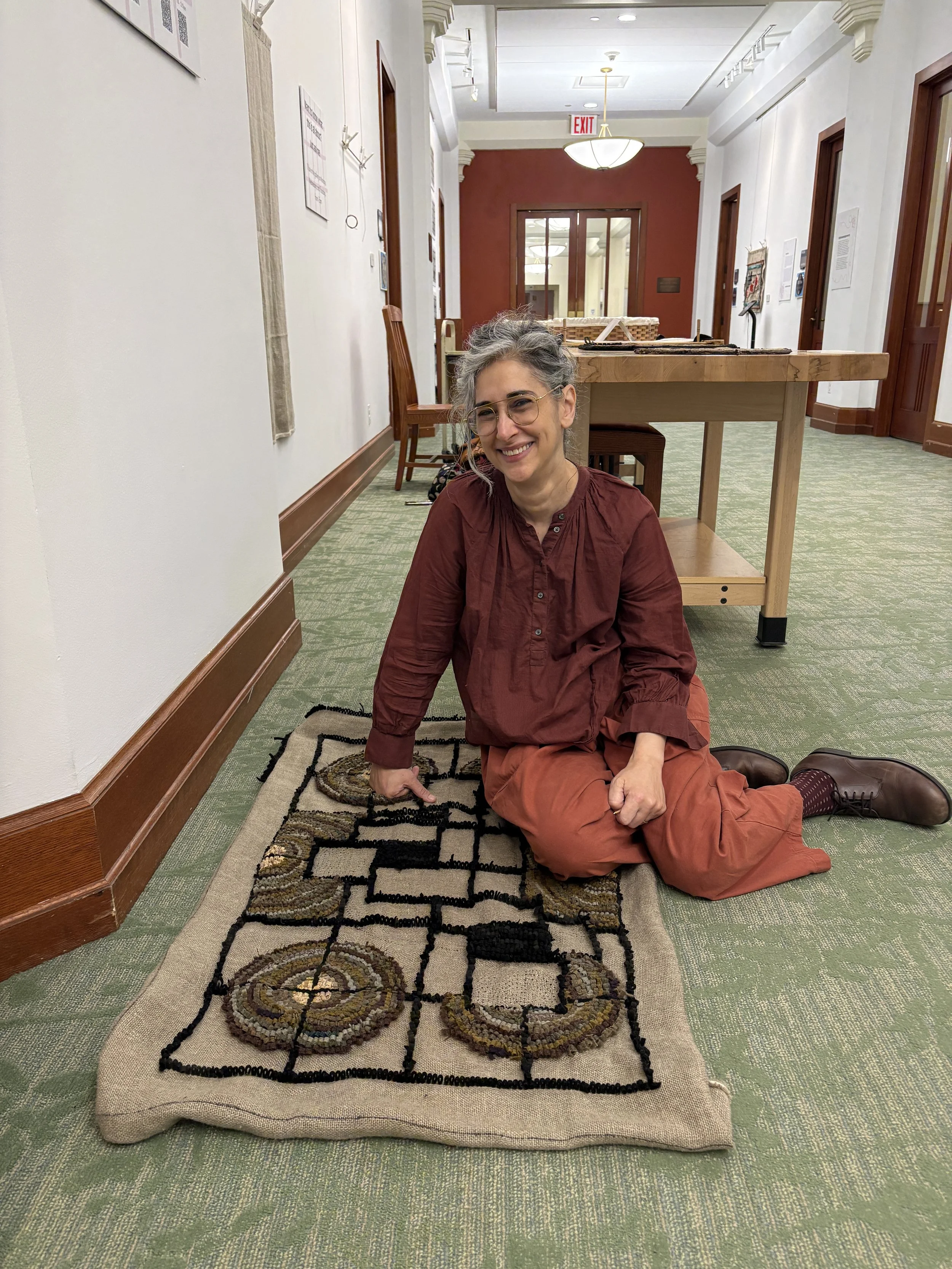 My primary practice is rug hooking, and I admire the ingenuity of the artist/makers who established it in North America in the 19th century. Many of their pieces can be read as autoethnographic text, featuring images, symbols, and materials that held significance for them. I carry this forward in my own work. I can encrypt a rug with signals, symbols, and messages, letting the object become a carrier of meaning (for me), even as it appears to be a decorative, functional item (to others). I welcome that opacity, exploring the possibility of a duality of meaning in shared domestic spaces.
